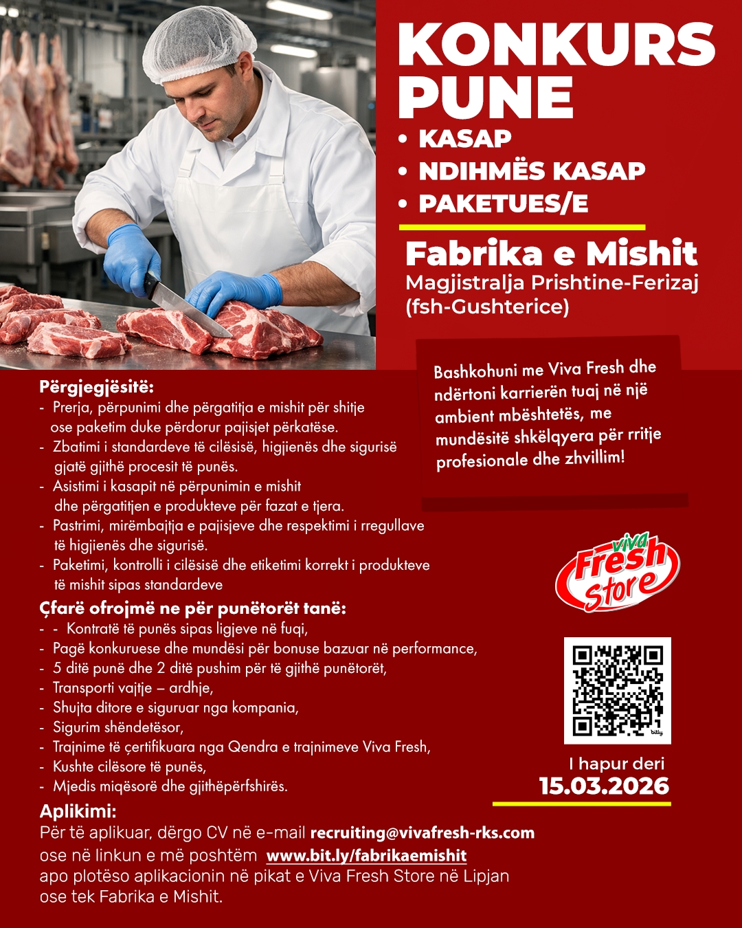 Për të aplikuar, dërgo CV në e-mail recruiting@vivafresh-rks.com ose në linkun e më poshtëm